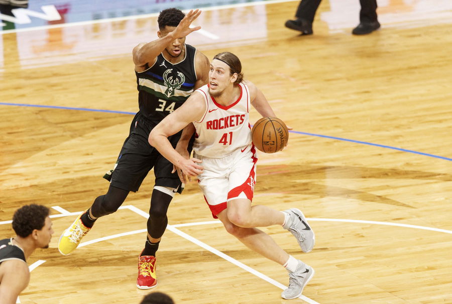 May 7, 2021; Milwaukee, Wisconsin, USA; Houston Rockets center Kelly Olynyk (41) drives for the basket against Milwaukee Bucks forward Giannis Antetokounmpo (34) during the first quarter at Fiserv Forum. Mandatory Credit: Jeff Hanisch-USA TODAY Sports