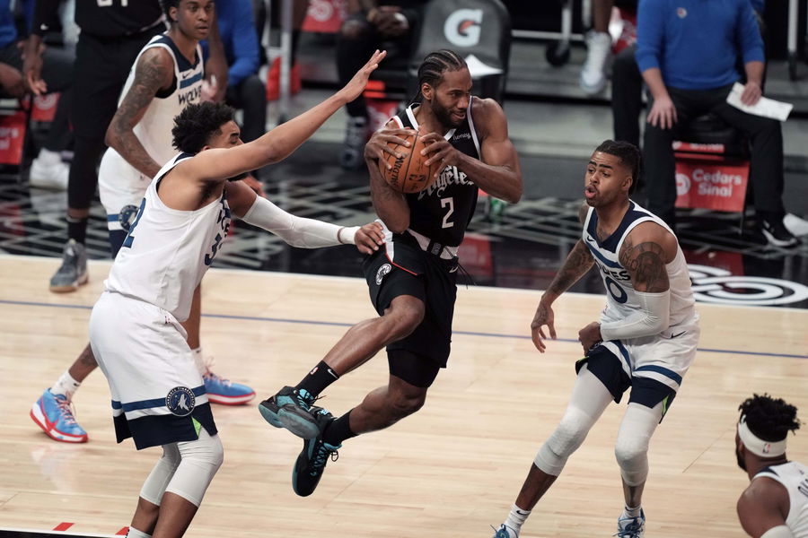 Apr 18, 2021; Los Angeles, California, USA; LA Clippers forward Kawhi Leonard (2) is defended by Minnesota Timberwolves center Karl-Anthony Towns (32) and guard D’Angelo Russell (0) in the first half at Staples Center. Mandatory Credit: Kirby Lee-USA TODAY Sports