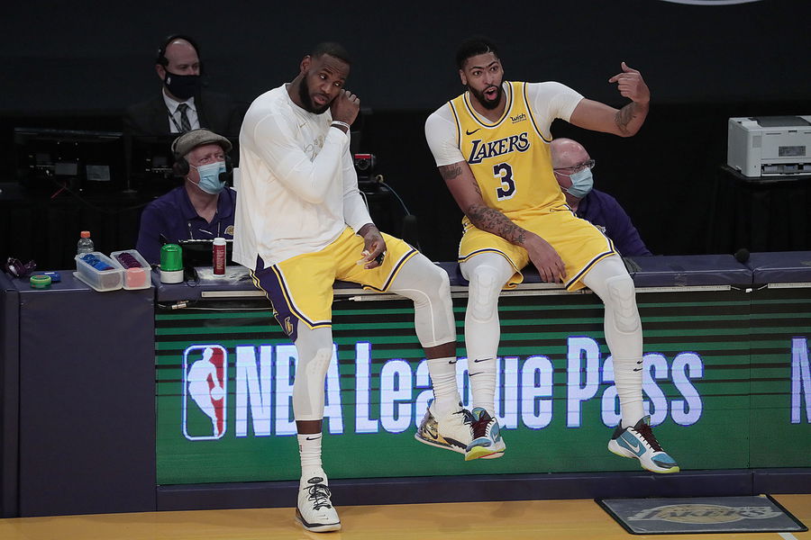 Los Angeles, CA, Tuesday, December 22, 2020 – Los Angeles Lakers forward LeBron James (23) and Los Angeles Lakers forward Anthony Davis (3) talk during a break in the action against the Clippers at Staples Center. (Robert Gauthier/ Los Angeles Times via Getty Images)