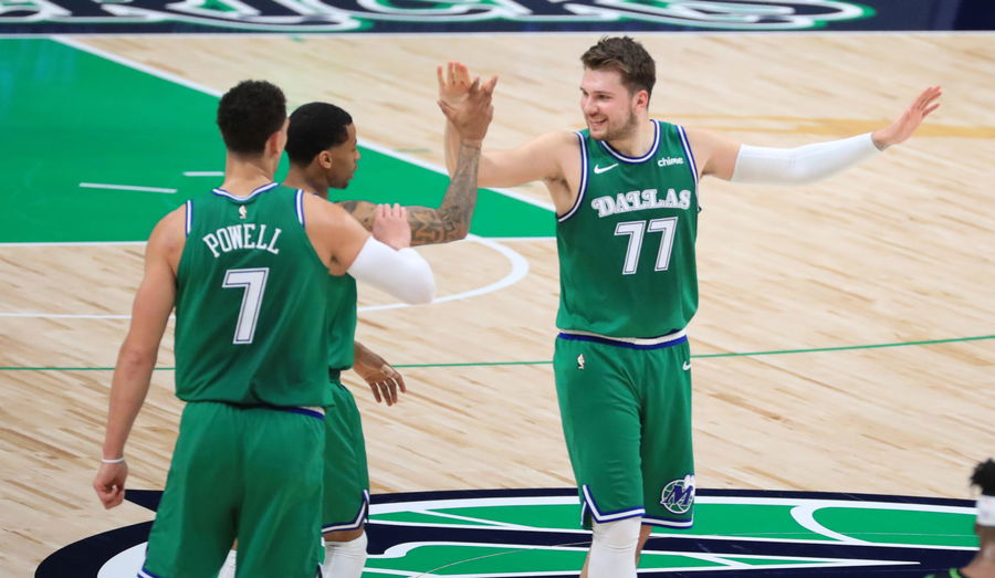 Feb 8, 2021; Dallas, Texas, USA; Dallas Mavericks guard Luka Doncic (77) celebrates with guard Trey Burke (3) and center Dwight Powell (7) during the first half against the Minnesota Timberwolves at American Airlines Center. Mandatory Credit: Kevin Jairaj-USA TODAY Sports
