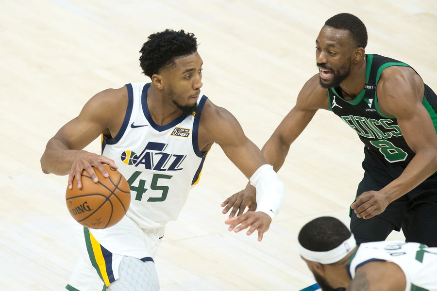 Feb 9, 2021; Salt Lake City, Utah, USA; Utah Jazz guard Donovan Mitchell (45) dribbles the ball against Boston Celtics guard Kemba Walker (8) during the second half at Vivint Smart Home Arena. Mandatory Credit: Russell Isabella-USA TODAY Sports