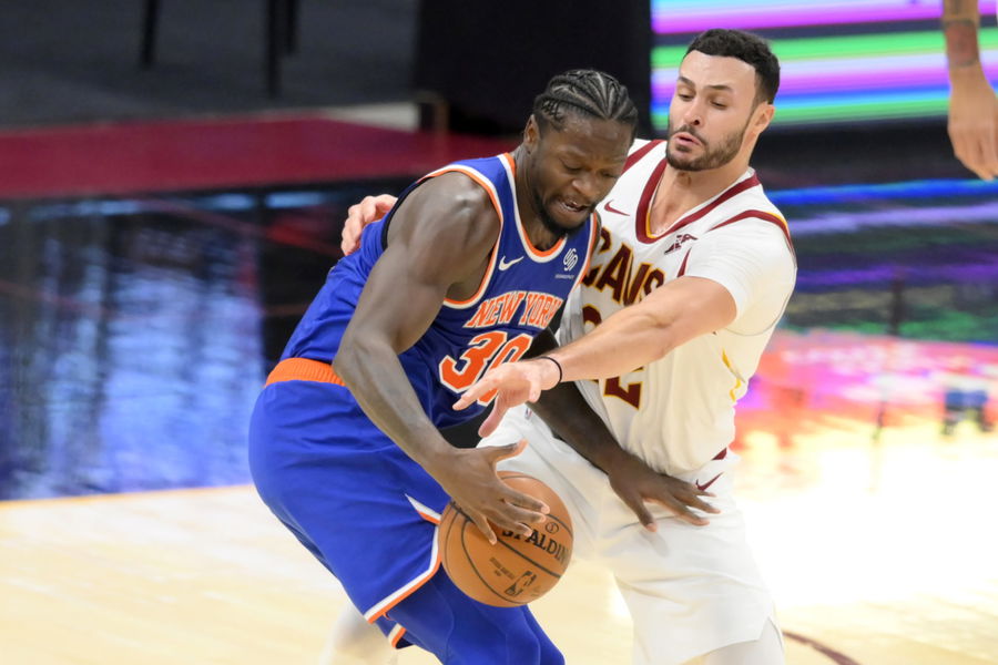Dec 29, 2020; Cleveland, Ohio, USA; Cleveland Cavaliers forward Larry Nance Jr. (22) defends New York Knicks forward Julius Randle (30) in the third quarter at Rocket Mortgage FieldHouse. Mandatory Credit: David Richard-USA TODAY Sports