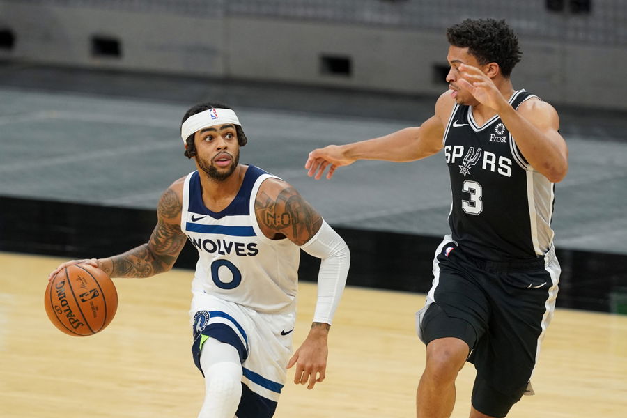 Feb 3, 2021; San Antonio, Texas, USA; Minnesota Timberwolves guard D’Angelo Russell (0) dribbles past San Antonio Spurs forward Keldon Johnson (3) in the second half at the AT&T Center. Mandatory Credit: Daniel Dunn-USA TODAY Sports