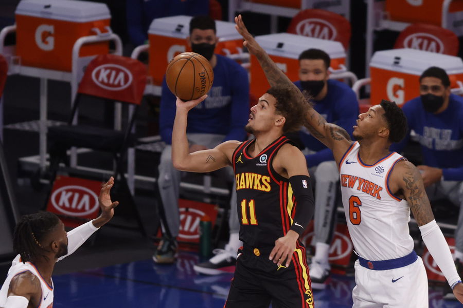 Feb 15, 2021; New York, New York, USA; Atlanta Hawks’ Trae Young (11) shoots against New York Knicks’ Elfrid Payton (6) and Nerlens Noel (3) during the first quarter at Madison Square Garden. Mandatory Credit: Jason DeCrow/Pool Photo-USA TODAY Sports