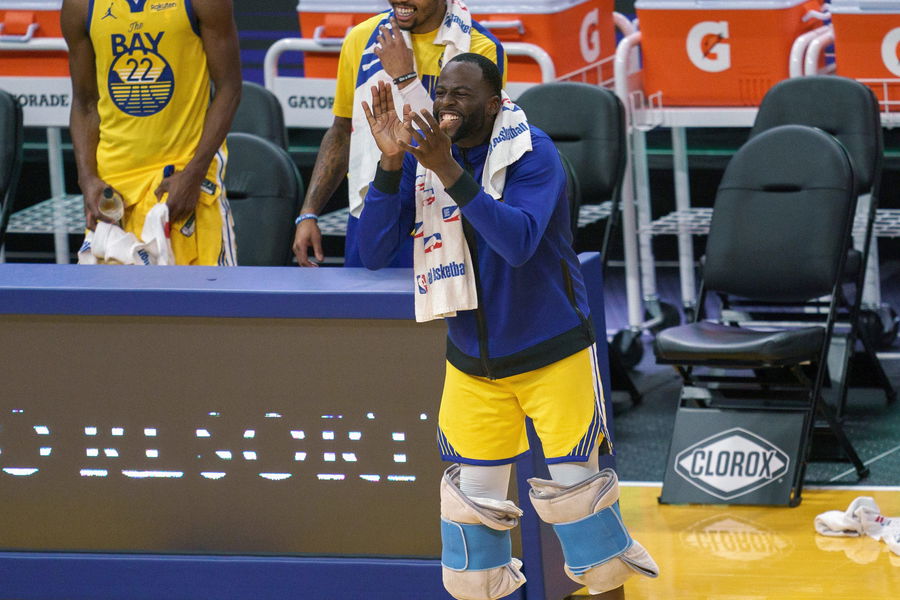Jan 4, 2021; San Francisco, California, USA; Golden State Warriors forward Draymond Green (23) celebrates on the sideline during the fourth quarter against the Sacramento Kings at Chase Center. Mandatory Credit: Neville E. Guard-USA TODAY Sports