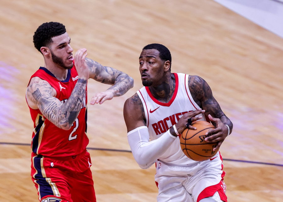 Feb 9, 2021; New Orleans, Louisiana, USA; Houston Rockets guard John Wall (R) drives to the basket while defended by New Orleans Pelicans guard Lonzo Ball (2) during the first half at the Smoothie King Center. Mandatory Credit: Stephen Lew-USA TODAY Sports