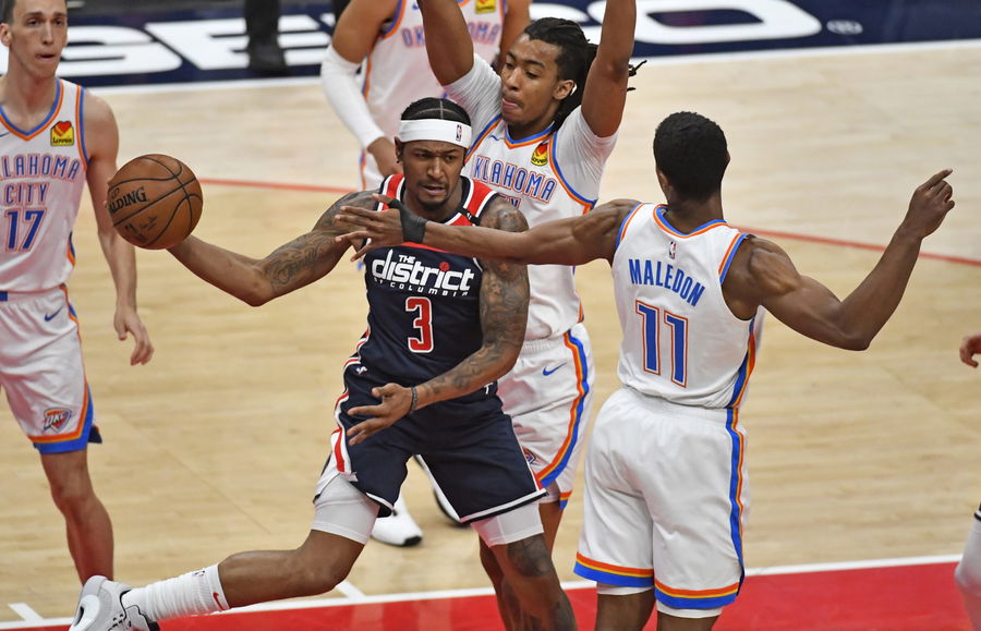 Apr 19, 2021; Washington, District of Columbia, USA; Washington Wizards guard Bradley Beal (3) pass against Oklahoma City Thunder guard Theo Maledon (11) during the first quarter at Capital One Arena. Mandatory Credit: Brad Mills-USA TODAY Sports