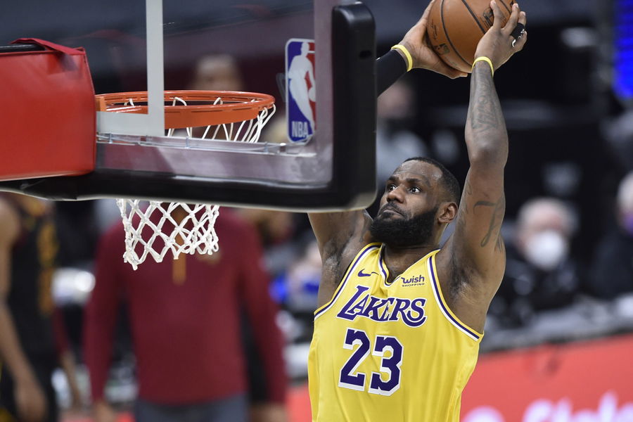 Lakers forward LeBron James dunks in the fourth quarter against the Cavaliers at Rocket Mortgage FieldHouse. Mandatory Credit: David Richard-USA TODAY Sports