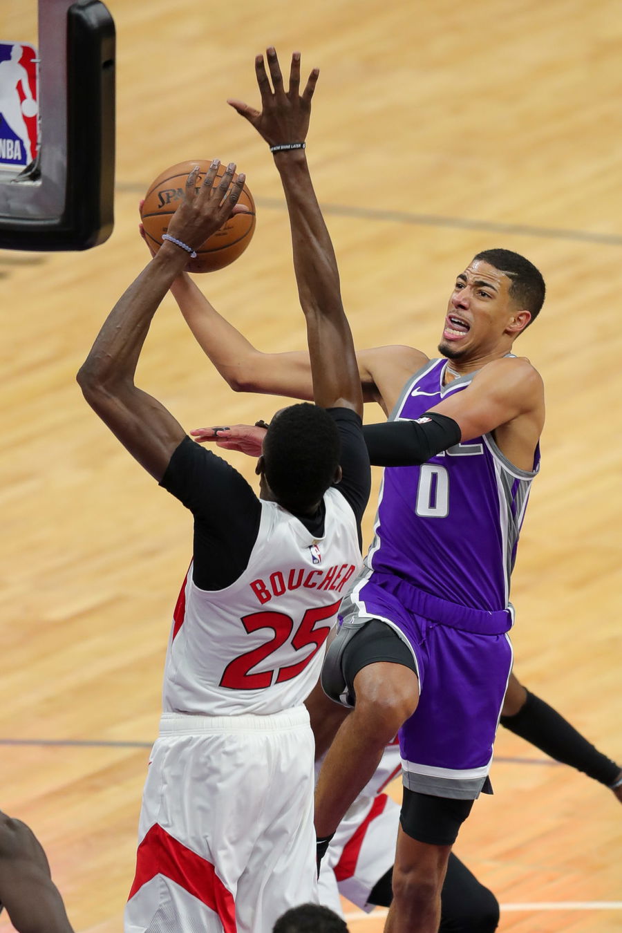 Jan 8, 2021; Sacramento, California, USA; Sacramento Kings guard Tyrese Haliburton (0) drives to the basket against Toronto Raptors forward Chris Boucher (25) during the third quarter at Golden 1 Center. Mandatory Credit: Sergio Estrada-USA TODAY Sports