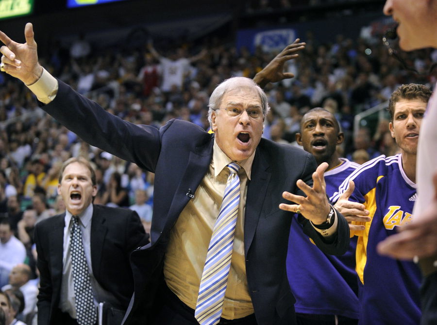 SALT LAKE CITY, UTAH APRIL 25, 2009Lakers head coach Phil Jackson wants a foul call from a referee against the Jazz in game 4 of the Western Conference playoffs in Salt Lake City Saturday. (Photo by Wally Skalij/Los Angeles Times via Getty Images)