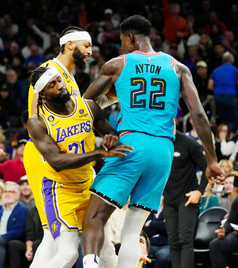 Nov 22, 2022; Phoenix, AZ, USA; Los Angeles Lakers guard Patrick Beverley (21) pushes Phoenix Suns center Deandre Ayton (22) to the court in the second half at Footprint Center. Beverley was ejected from the game. Mandatory Credit: Rob Schumacher-Arizona Republic