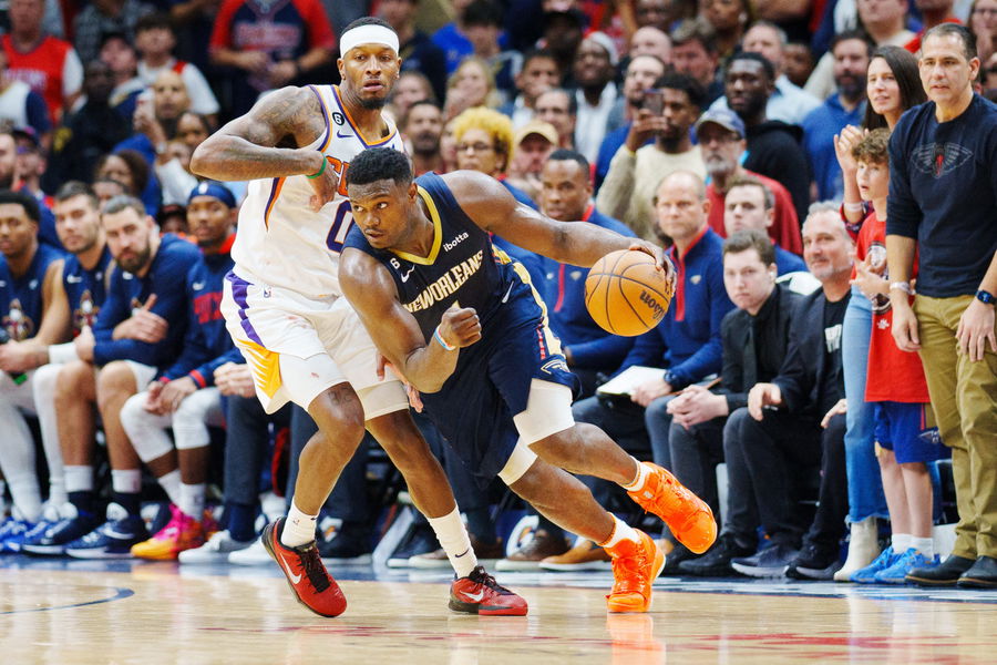 Dec 11, 2022; New Orleans, Louisiana, USA; New Orleans Pelicans forward Zion Williamson (1) drives to the basket against Phoenix Suns forward Torrey Craig (0) during overtime at Smoothie King Center. Mandatory Credit: Andrew Wevers-USA TODAY Sports