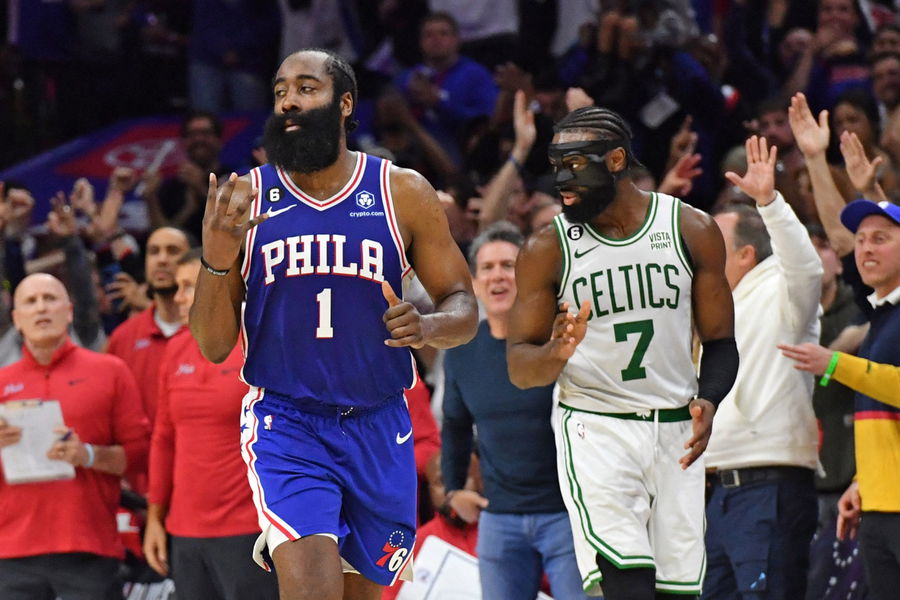 May 7, 2023; Philadelphia, Pennsylvania, USA; Philadelphia 76ers guard James Harden (1) reacts after making game-winning three point basket against the Boston Celtics during overtime of game four of the 2023 NBA playoffs at Wells Fargo Center. Mandatory Credit: Eric Hartline-USA TODAY Sports