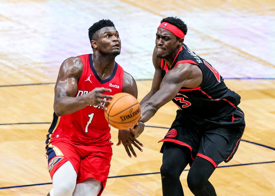 Jan 2, 2021; New Orleans, Louisiana, USA; New Orleans Pelicans forward Zion Williamson (1) is fouled by Toronto Raptors forward Pascal Siakam (43) during the fourth quarter at the Smoothie King Center. Mandatory Credit: Stephen Lew-USA TODAY Sports