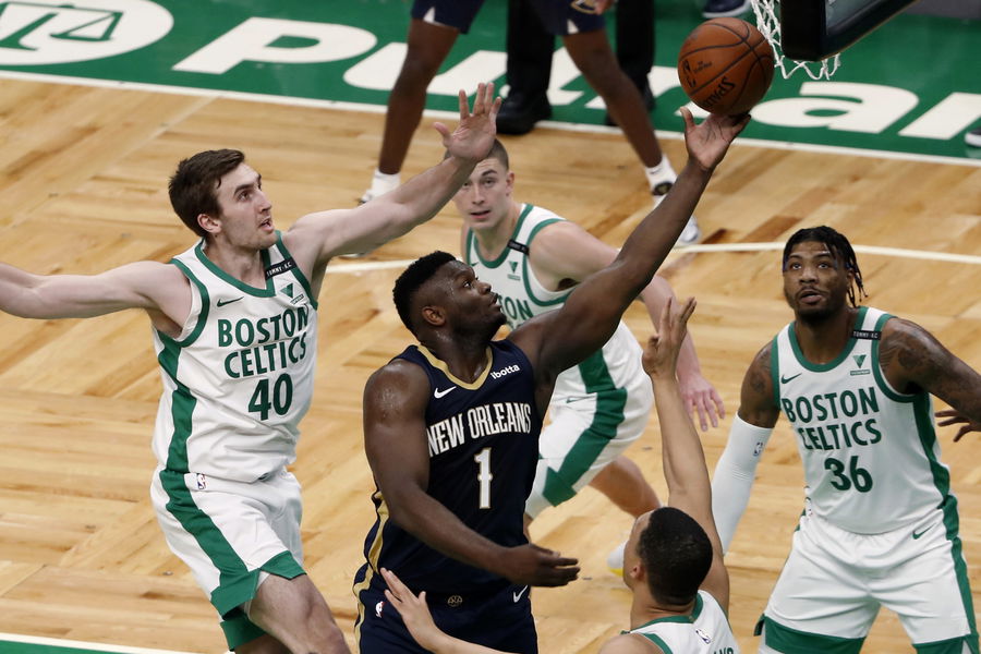 Mar 29, 2021; Boston, Massachusetts, USA; New Orleans Pelicans forward Zion Williamson (1) goes to the basket as Boston Celtics center Luke Kornet (40) and guard Marcus Smart (36) look on during the second quarter at TD Garden. Mandatory Credit: Winslow Townson-USA TODAY Sports