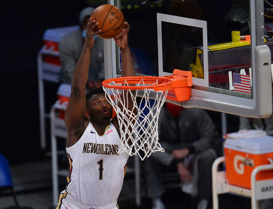 Jan 15, 2021; Los Angeles, California, USA; New Orleans Pelicans forward Zion Williamson (1) dunks to score a basket against the Los Angeles Lakers during the first half at Staples Center. Mandatory Credit: Gary A. Vasquez-USA TODAY Sports