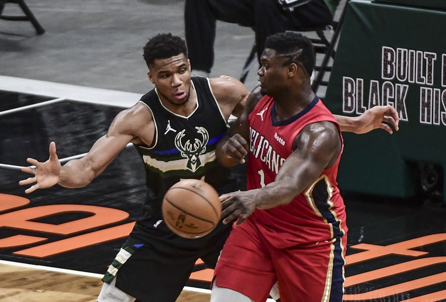 Feb 25, 2021; Milwaukee, Wisconsin, USA; Milwaukee Bucks forward Giannis Antetokounmpo (34) pressures New Orleans Pelicans forward Zion Williamson (1) in the third quarter at Fiserv Forum. Mandatory Credit: Benny Sieu-USA TODAY Sports