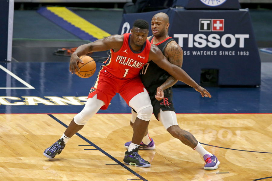 Jan 30, 2021; New Orleans, Louisiana, USA; New Orleans Pelicans forward Zion Williamson (1) is defended by Houston Rockets forward P.J. Tucker (17) in the first quarter at the Smoothie King Center. Mandatory Credit: Chuck Cook-USA TODAY Sports