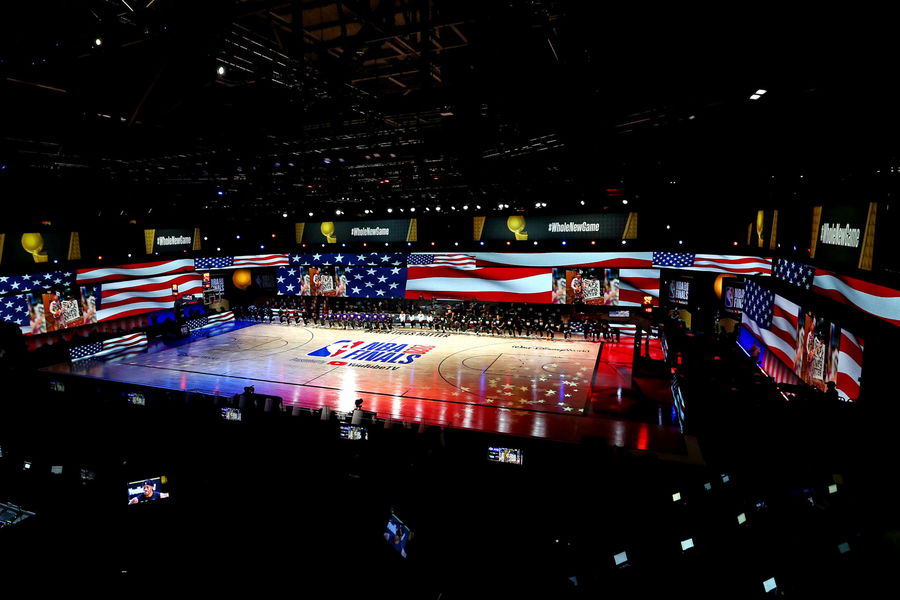 Oct 2, 2020; Orlando, Florida, USA; The Los Angeles Lakers and the Miami Heat kneel for the national anthem before game two of the 2020 NBA Finals at AdventHealth Arena. Mandatory Credit: Kim Klement-USA TODAY Sports