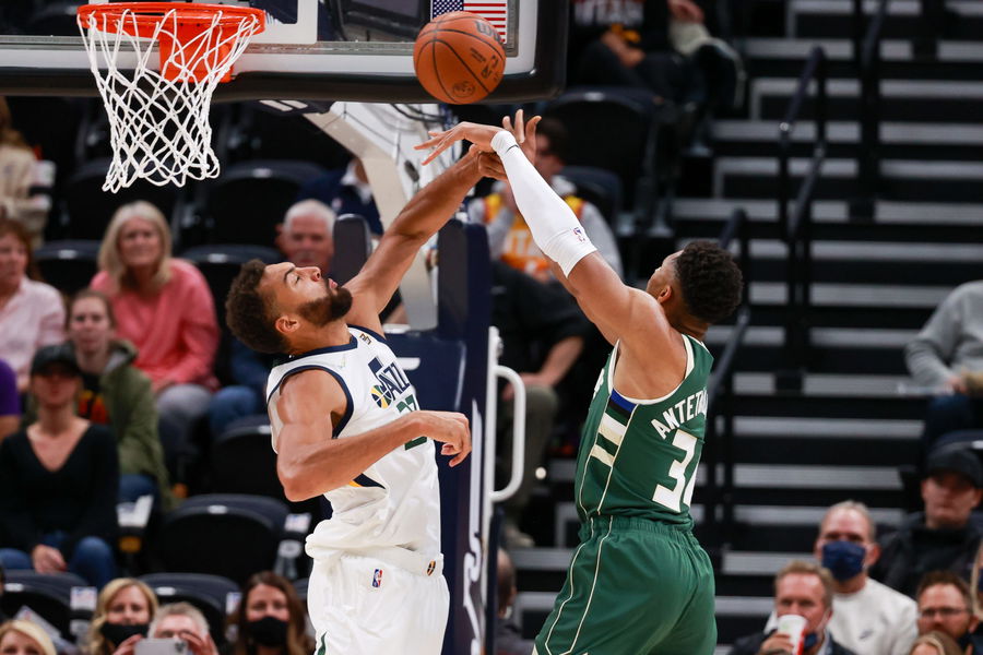 Oct 13, 2021; Salt Lake City, Utah, USA; Milwaukee Bucks forward Giannis Antetokounmpo (34) is fouled by Utah Jazz center Rudy Gobert (27) while shooting the ball during the first quarter at Vivint Arena. Mandatory Credit: Chris Nicoll-USA TODAY Sports