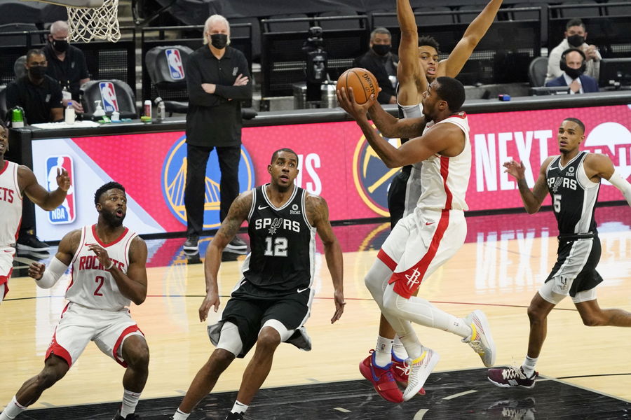 Jan 14, 2021; San Antonio, Texas, USA; Houston Rockets guard Sterling Brown (0) drives to the basket against San Antonio Spurs forwards LaMarcus Aldridge (12) and Keldon Johnson (3) in the fourth quarter at AT&T Center. Mandatory Credit: Scott Wachter-USA TODAY Sports
