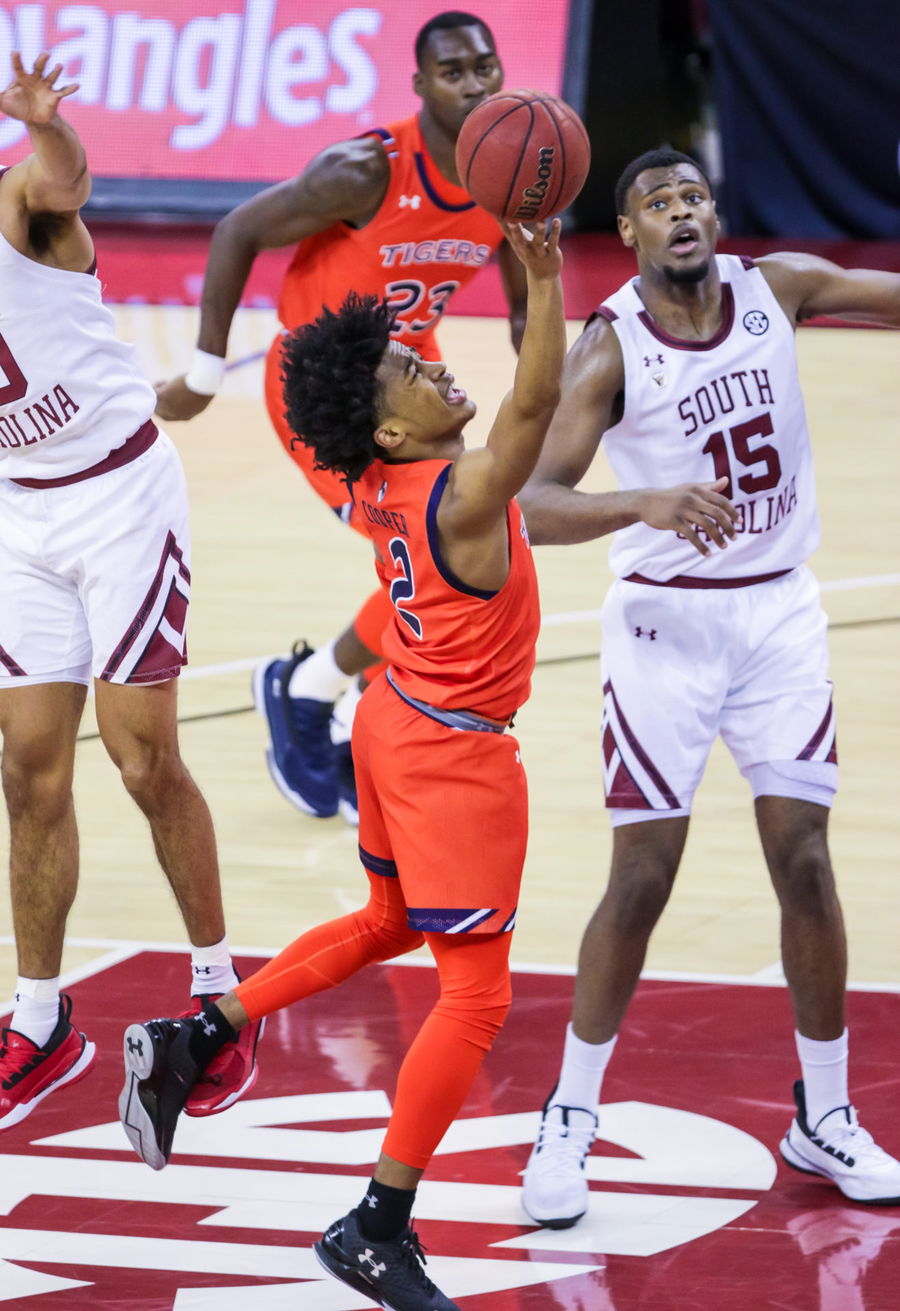 Jan 23, 2021; Columbia, South Carolina, USA; Auburn Tigers guard Sharife Cooper (2) shoots against the South Carolina Gamecocks in the second half at Colonial Life Arena. Mandatory Credit: Jeff Blake-USA TODAY Sports