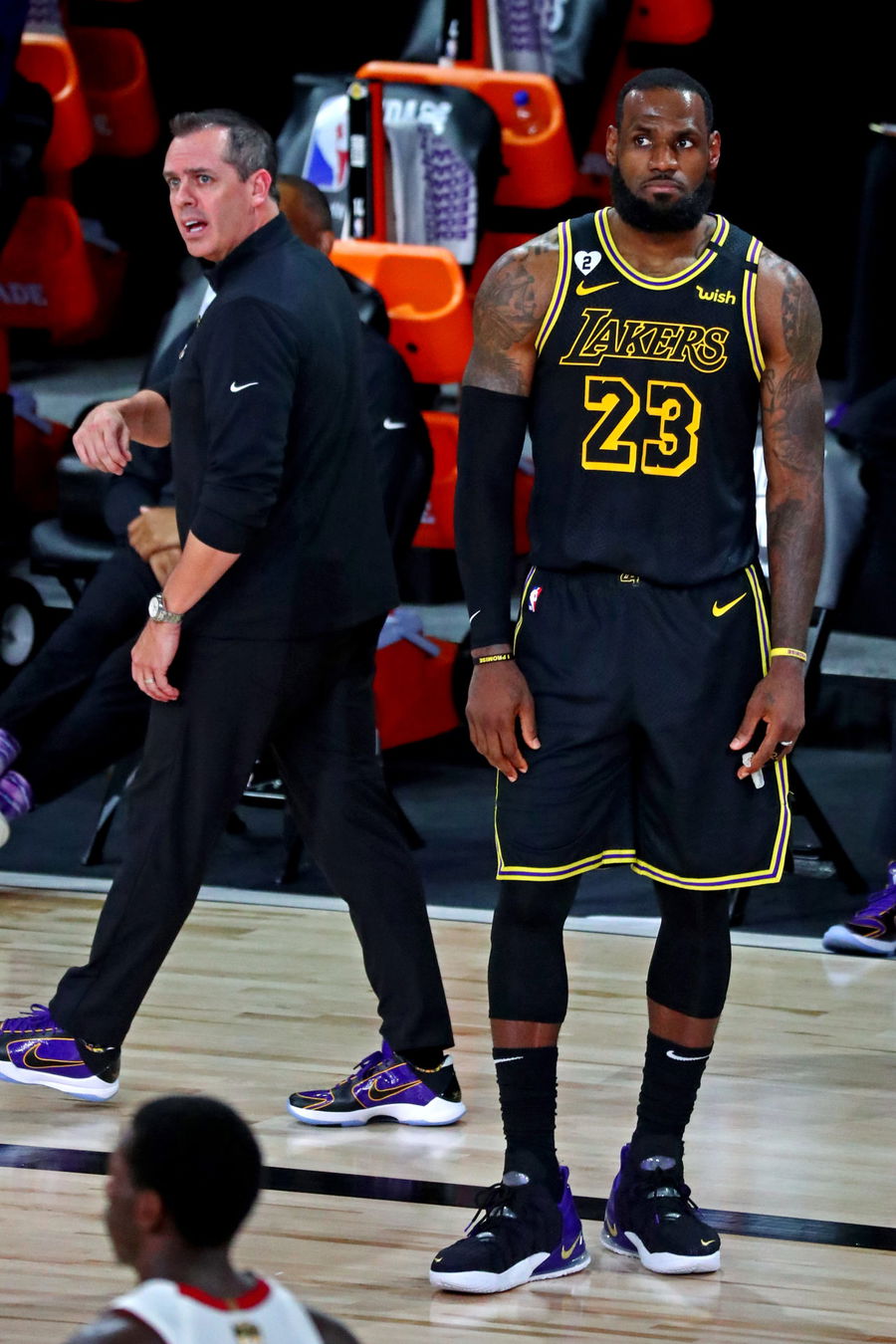 Los Angeles Lakers forward LeBron James (23) and head coach Frank Vogel reacts during the fourth quarter against the Miami Heat in game five of the 2020 NBA Finals at AdventHealth Arena. Mandatory Credit: Kim Klement-USA TODAY Sports