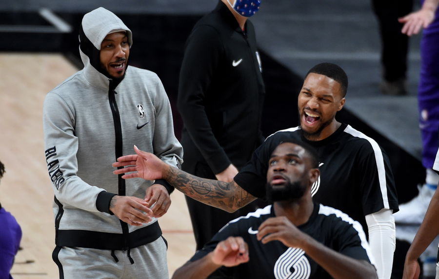 Dec 11, 2020; Portland, Oregon, USA; Portland Trail Blazers forward Carmelo Anthony (00) and guard Damian Lillard (0) share a laugh before the game against the Sacramento Kings at Moda Center. Mandatory Credit: Steve Dykes-USA TODAY Sports