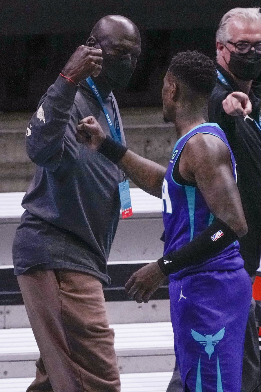 NBA, Basketball Herren, USA Detroit Pistons at Charlotte Hornets, Mar 11, 2021 Charlotte, North Carolina, USA Charlotte Hornets guard Terry Rozier 3 exchange s a high five with owner Michael Jordan after the win over the Detroit Pistons at Spectrum Center. Mandatory Credit: Jim Dedmon-USA TODAY Sports, 11.03.2021 21:18:41, 15709944, Michael Jordan, Charlotte Hornets, Spectrum Center, Terry Rozier, Detroit Pistons, NBA PUBLICATIONxINxGERxSUIxAUTxONLY Copyright: xJimxDedmonx 15709944