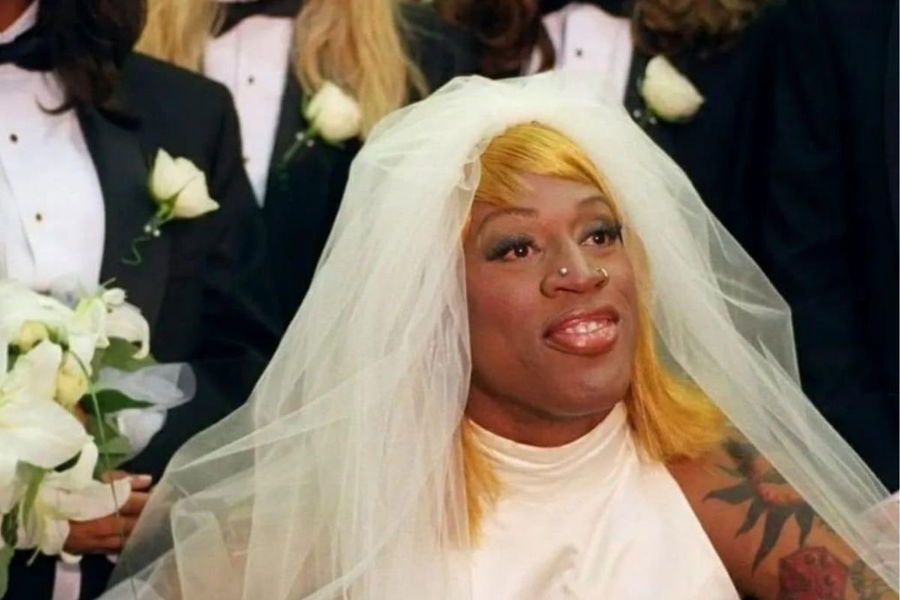 It started one night in a hotel gym in New York. Dennis Rodman was working out when he saw Steven Tyler from Aerosmith. They were riding bikes next to each other when Rodman asked, “You think I should wear a wedding dress to my book signing today?” Rodman recalled, Tyler didn’t miss a beat: “Go ahead, baby. Go ahead.” After receiving a positive response about his plans, the Chicago Bulls icon took extra measures to pull off the perfect look.