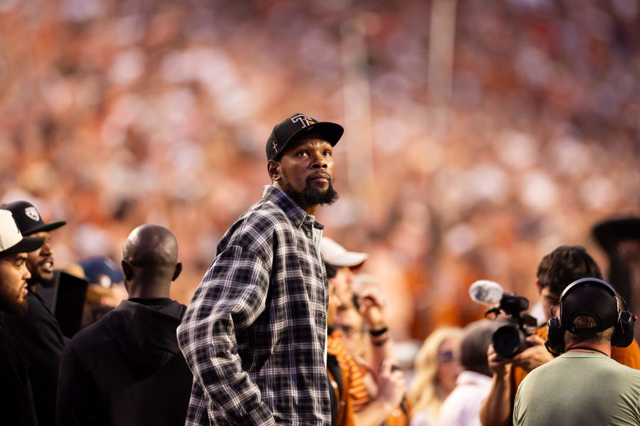 Oct 19, 2024; Austin, Texas, USA; Kevin Durant in the first quarter against the Georgia Bulldogs at Darrell K Royal-Texas Memorial Stadium. Mandatory Credit: Brett Patzke-Imagn Images