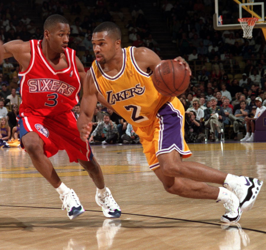 Laker rookie Derek Fisher(right) drives on Philadelphia 76er rookie Allen Iverson during game at the Forum earlier this season. (Photo by Vince Compagnone/Los Angeles Times via Getty Images)
