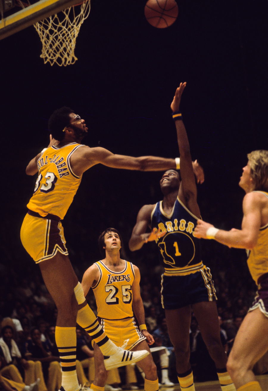 Unknown date and unknown location; USA; FILE PHOTO; Golden State Warriors guard Gus Williams (1) against Los Angeles Lakers center Kareem Abdul-Jabbar (33). Mandatory Credit: Malcolm Emmons-USA TODAY Network.