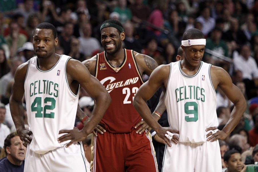 Apr 4, 2010; Boston, MA, USA; Cleveland Cavaliers forward LeBron James (23) waits for a free-throw along with Boston Celtics guard Rajon Rondo (9) and guard Tony Allen (42) during the 2nd half at the TD Banknorth Garden. The Celtics defeated the Cavaliers 117-113. Mandatory Credit: David Butler II-USA TODAY Sports