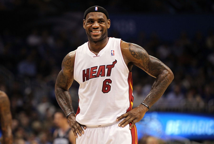 February 3, 2011; Orlando, FL, USA; Miami Heat small forward LeBron James (6) points and smiles during the first quarter against the Orlando Magic at Amway Center. Mandatory Credit: Kim Klement-USA TODAY Sports