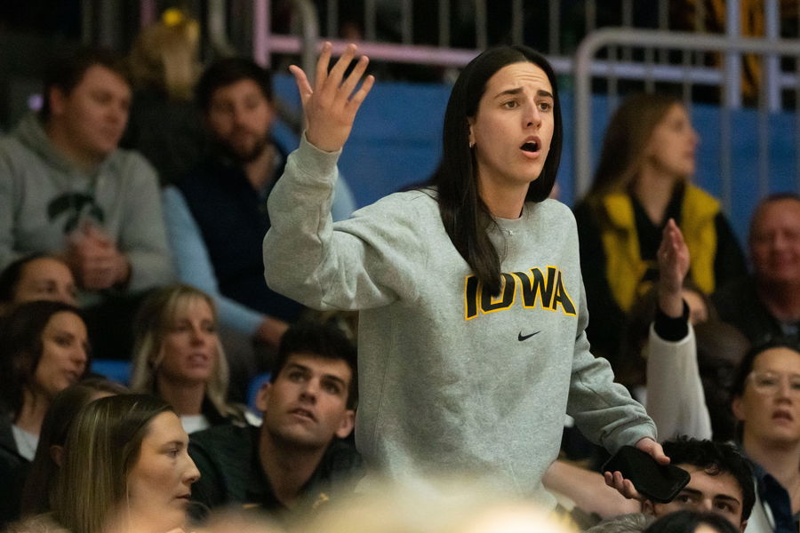 Former Iowa women’s basketball player Caitlin Clark reacts after a foul call on Iowa during the Drake vs. Iowa basketball game at Knapp Center on Sunday, Nov. 17, 2024, in Des Moines.