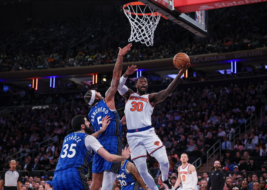Jan 15, 2024; New York, New York, USA; New York Knicks forward Julius Randle (30) ) drives for a shot during the second half as Orlando Magic forward Paolo Banchero (5) and center Goga Bitadze (35) defend at Madison Square Garden. Mandatory Credit: Vincent Carchietta-USA TODAY Sports