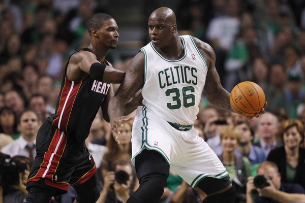 Oct 26, 2010; Boston, MA, USA; Boston Celtics center Shaquille O’Neal (36) works the ball during the first half against Miami Heat forward Chris Bosh (left) at the TD Garden. Mandatory Credit: David Butler II-USA TODAY Sports