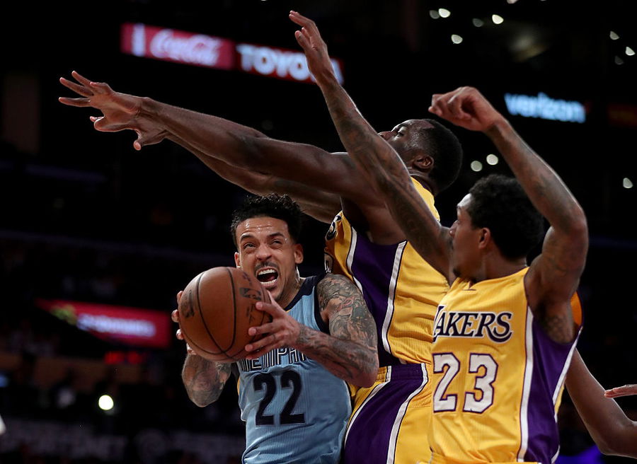 LOS ANGELES, CA – MARCH 22: Matt Barnes #22 of the Memphis Grizzlies drives to the basket against Louis Williams #23 and Brandon Bass #2 of the Los Angeles Lakers during the second half of a game at Staples Center on March 22, 2016 in Los Angeles, California. (Photo by Sean M. Haffey/Getty Images)