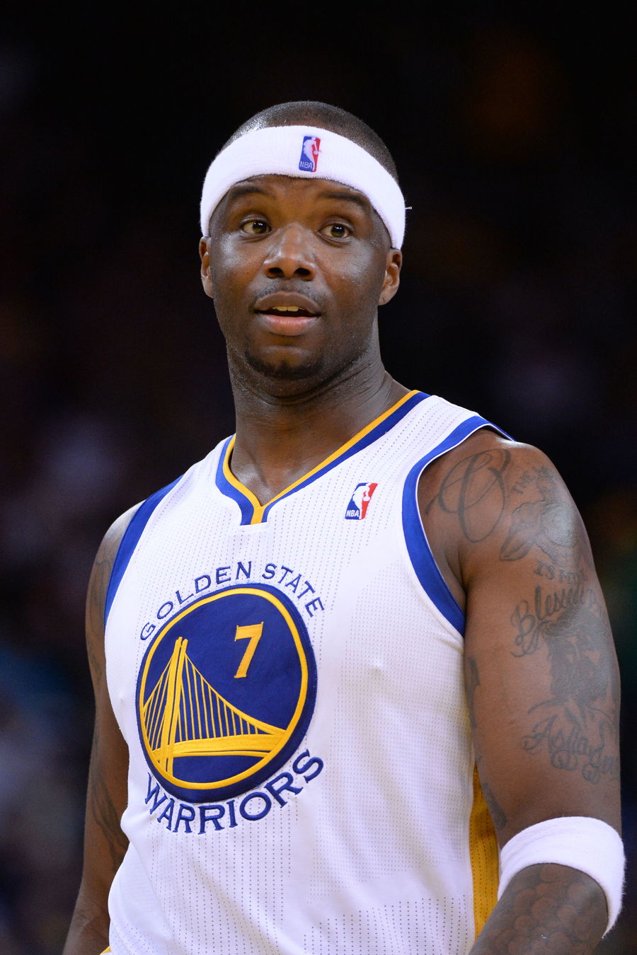 Apr 6, 2014; Oakland, CA, USA; Golden State Warriors center Jermaine O’Neal (7) looks on against the Utah Jazz during the third quarter at Oracle Arena. The Warriors defeated the Jazz 130-102. Mandatory Credit: Kyle Terada-USA TODAY Sports