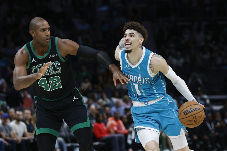 Nov 2, 2024; Charlotte, North Carolina, USA; Charlotte Hornets guard LaMelo Ball (1) drives to the basket against Boston Celtics center Al Horford (42) during the second half at Spectrum Center. Mandatory Credit: Nell Redmond-Imagn Images