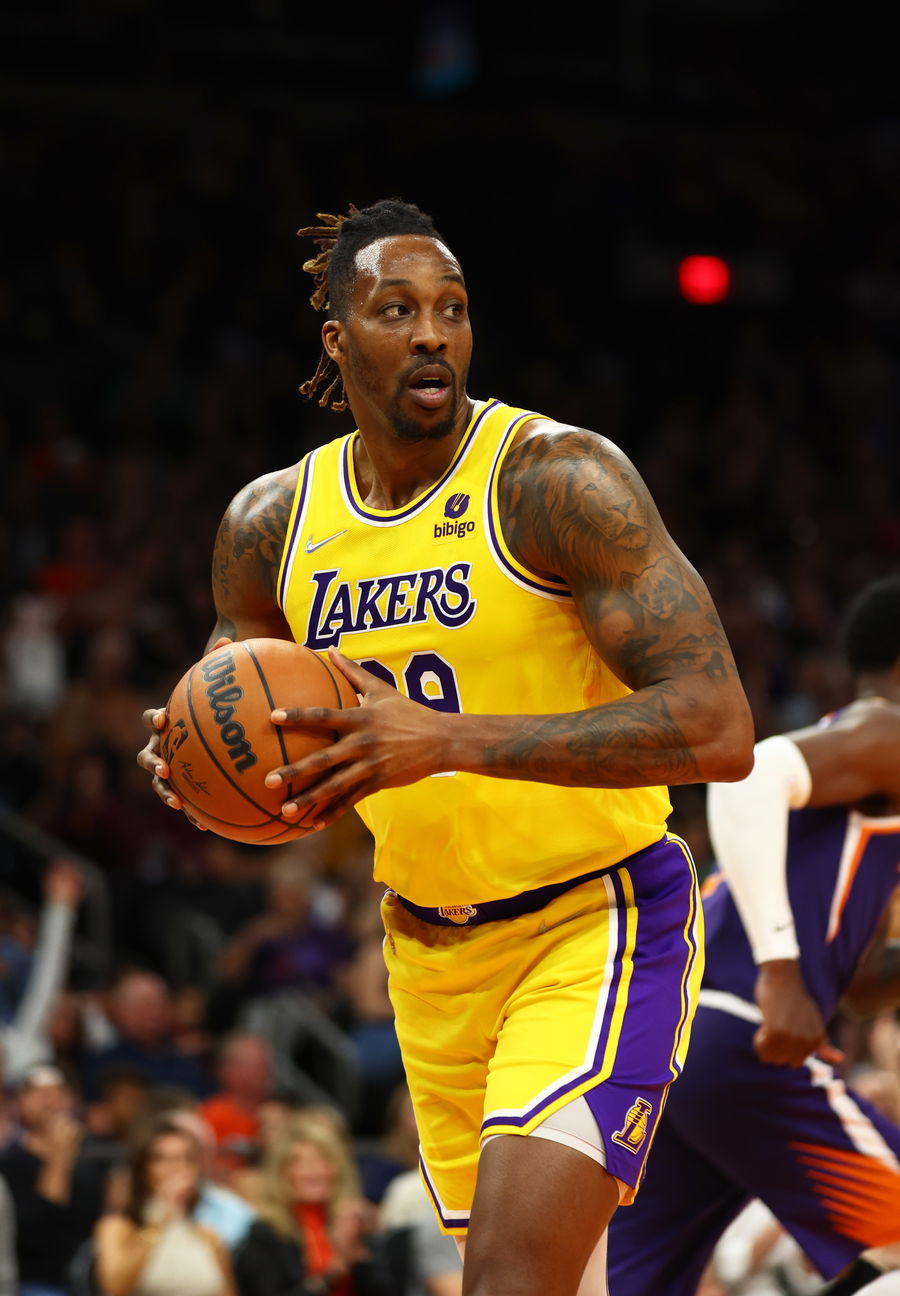 Apr 5, 2022; Phoenix, Arizona, USA; Los Angeles Lakers center Dwight Howard (39) against the Phoenix Suns at Footprint Center. Mandatory Credit: Mark J. Rebilas-USA TODAY Sports