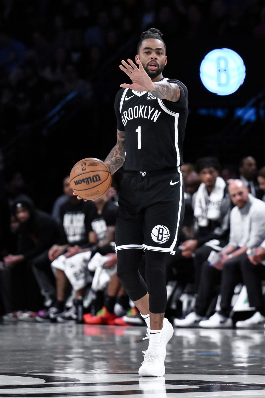 Feb 20, 2025; Brooklyn, New York, USA; Brooklyn Nets guard D’Angelo Russell (1) sets the play against the Cleveland Cavaliers during the first half at Barclays Center. Mandatory Credit: John Jones-Imagn Images