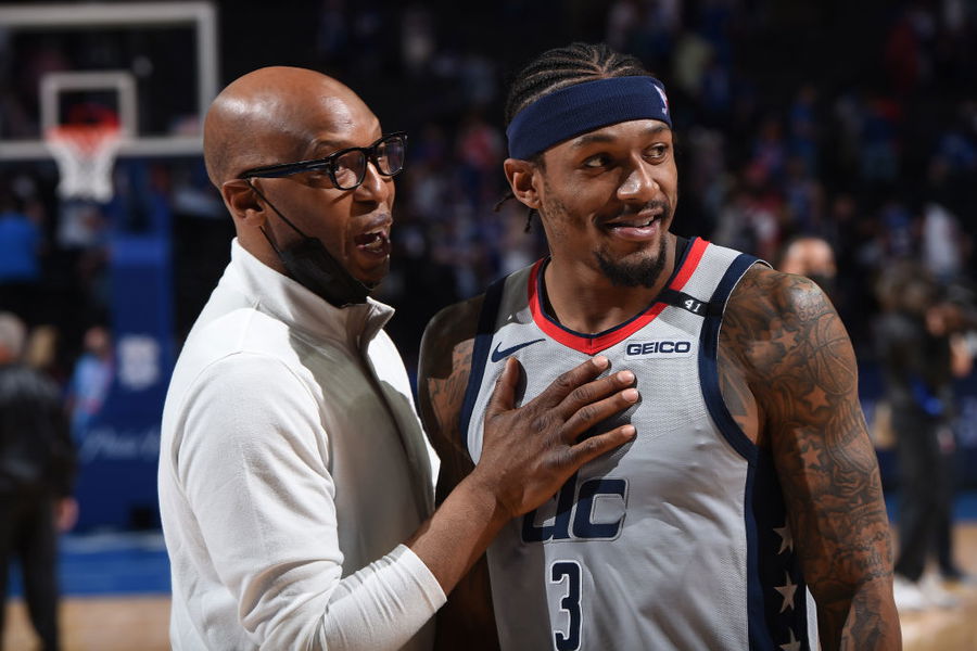 PHILADELPHIA, PA – JUNE 2: Assistant Coach Sam Cassell of the Philadelphia 76ers and Bradley Beal #3 of the Washington Wizards talk after a game during Round 1, Game 5 of the Eastern Conference Playoffs on June 2, 2021 at Wells Fargo Center in Philadelphia, Pennsylvania. NOTE TO USER: User expressly acknowledges and agrees that, by downloading and/or using this Photograph, user is consenting to the terms and conditions of the Getty Images License Agreement. Mandatory Copyright Notice: Copyright 2021 NBAE (Photo by David Dow/NBAE via Getty Images)