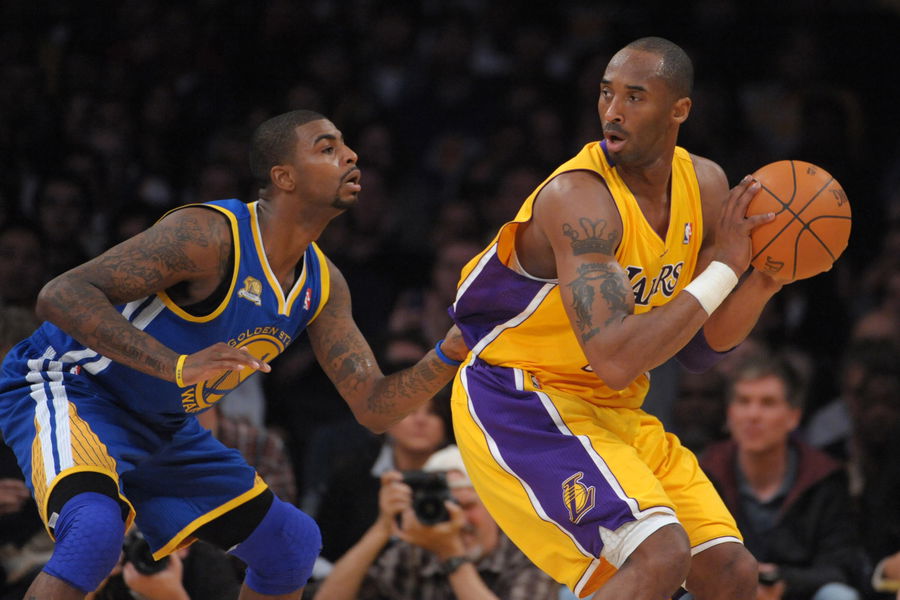Jan 6, 2011; Los Angeles, CA, USA; Los Angeles Lakers guard Kobe Bryant (24) is defended by Golden State Warriors forward Dorrell Wright (1) at the Staples Center. Mandatory Credit: Kirby Lee/Image of Sport-USA TODAY Sports