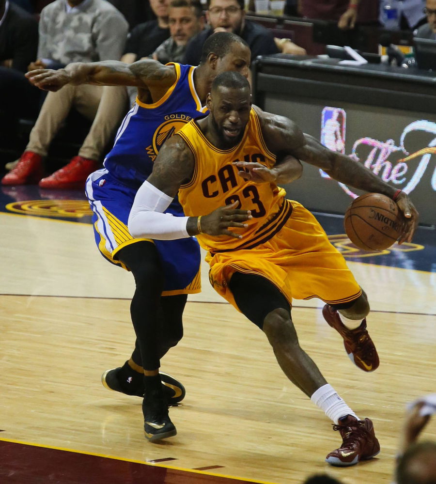 June 11, 2015 – Cleveland, OH, USA – The Cleveland Cavaliers LeBron James (23) protects the ball from the Golden State Warriors Andre Iguodala as he drives to the basket during the third quarter in Game 4 of the NBA Basketball Herren USA Finals at Quicken Loans Arena in Cleveland on Thursday, June 11, 2015. The Warriors won, 103-82, to tie the series. NBA Finals: Golden State at Cleveland, Game 4 – ZUMAm67_