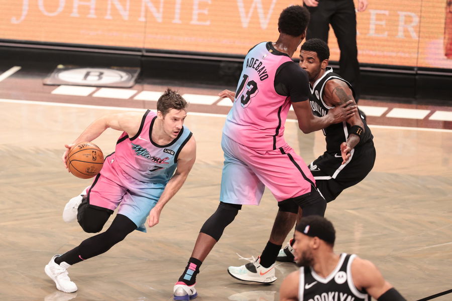 Jan 23, 2021; Brooklyn, New York, USA; Miami Heat guard Goran Dragic (7) dribbles the ball as center Bam Adebayo (13) screens Brooklyn Nets guard Kyrie Irving (11) during the first half at Barclays Center. Mandatory Credit: Vincent Carchietta-USA TODAY Sports