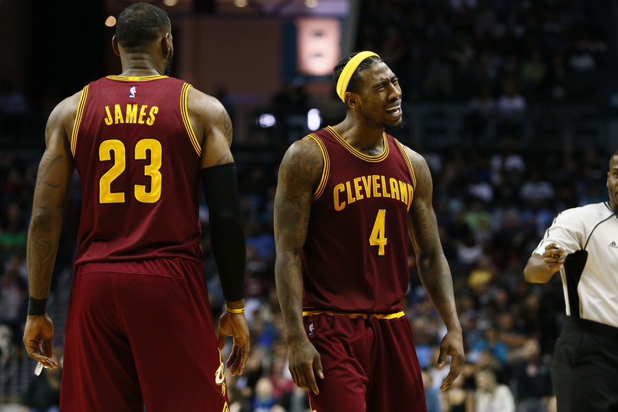 Mar 24, 2017; Charlotte, NC, USA; Cleveland Cavaliers guard Iman Shumpert (4) reacts to a foul call in the second half against the Charlotte Hornets at Spectrum Center. The Cavs defeated the Hornets 112-105. Mandatory Credit: Jeremy Brevard-USA TODAY Sports