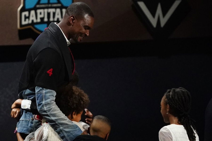 Sep 11, 2021; Springfield, MA, USA; Class of 2021 inductee Chris Bosh is greeted by his children after speaking during the Naismith Memorial Basketball Hall of Fame Enshrinement at MassMutual Center. Mandatory Credit: David Butler II-Imagn Images