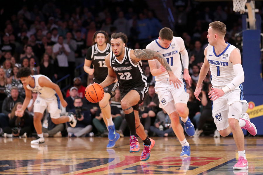 Mar 14, 2024; New York City, NY, USA; Providence Friars guard Devin Carter (22) brings the ball up court against Creighton Bluejays center Ryan Kalkbrenner (11) and guard Steven Ashworth (1) during the first half at Madison Square Garden. Mandatory Credit: Brad Penner-USA TODAY Sports